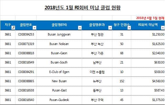 한국지국에서 4월 5일 현재 2018년 1월 RI회비 미납 클럽 현황을 보내왔습니다.