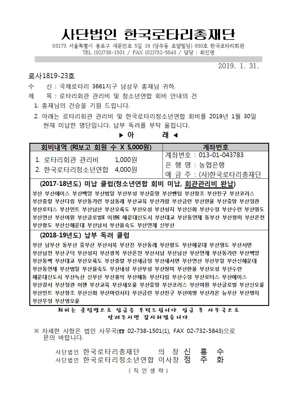 로타리회관 관리비 및 청소년 연합 회비 미납 (19.1.30일 기준)관련하여 한국로타리 총재단에서 첨부와 같이 미납클럽 명단을 알려 왔습니다.
