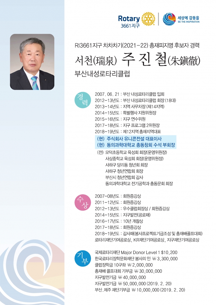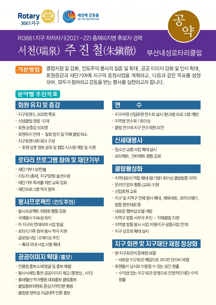 지난 2월 18일 게재된 차차차기총재 피지명자 선출일정 및 지침공고에 따라, 국제로타리3661지구 차차차기(2021-22)총재 피지명 후보자의 프로필 및 공약사항을 별첨하오니, 각 클럽에서는 회원들에게 반드시 배포 및 공지하여 주시기 바랍니다.