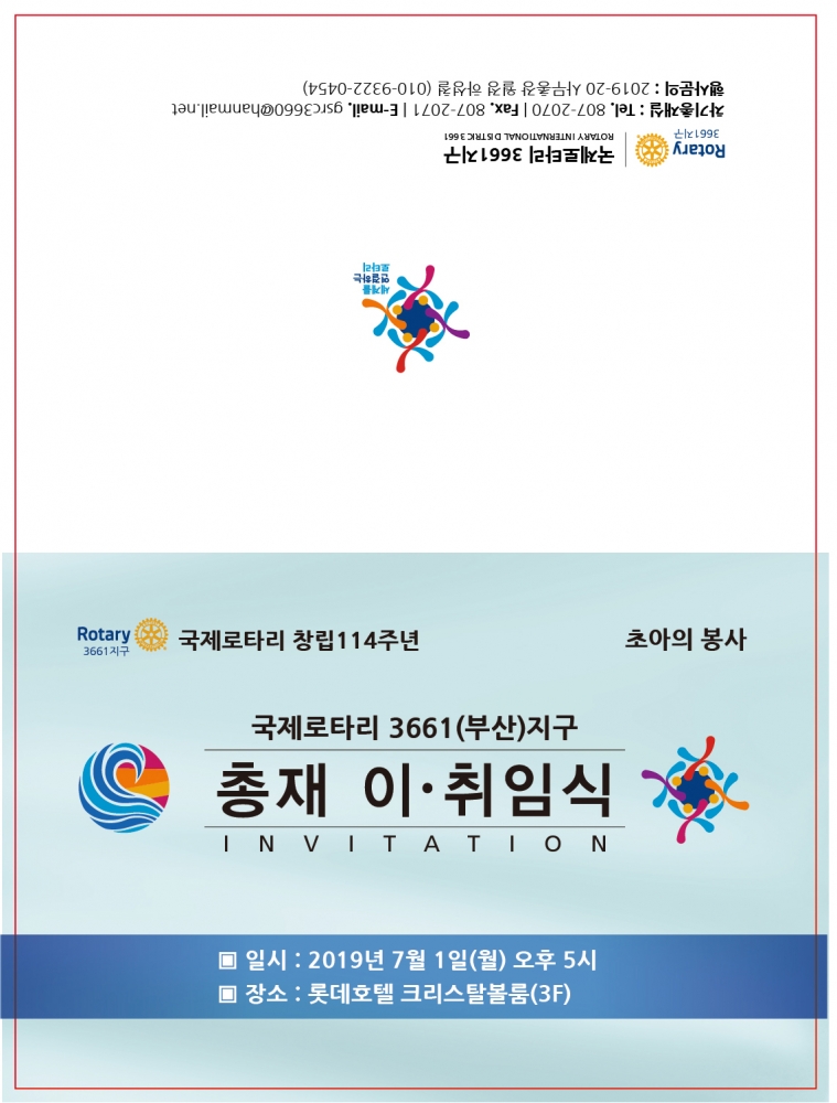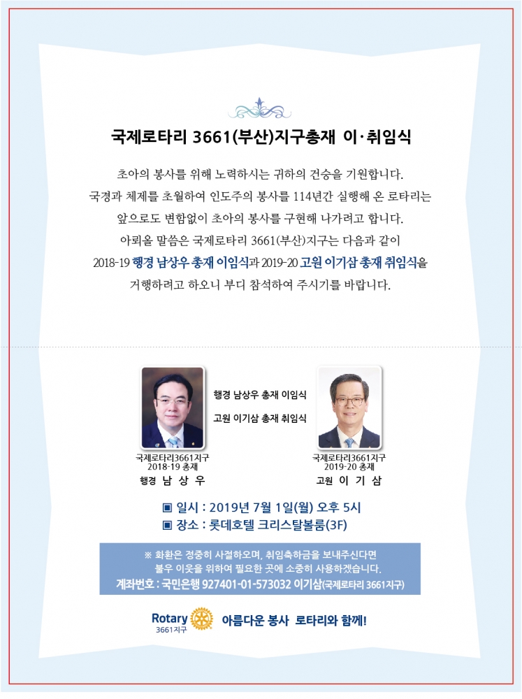 국제로타리 3661지구 2018-19 행경 남상우 총재 이임식과 2019-20 고원 이기삼 총재 취임식에 지역사회 지도자들과 귀하를 모시고자 하오니 지구의 결속과 단합된 시간이 될 수 있도록 자리를 함께해 주시기 바랍니다.