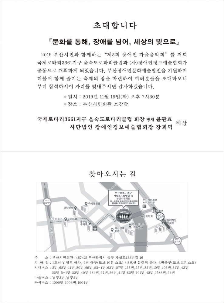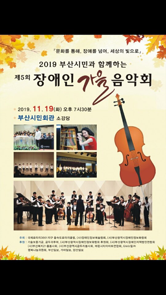 2019 부산시민과 함께하는 “제5회 장애인 가을음악회”를 부산을숙도 로타리클럽과 (사)장애인정보예술협회에서 공동으로 개최하게 되었습니다. 부산 장애인 문화 예술 발전을 기원하며 더불어 함께 즐기는 축제의 장을 마련되어 있사오니 관심 있는 로타리안들께서는 많은 참석 부탁드립니다.