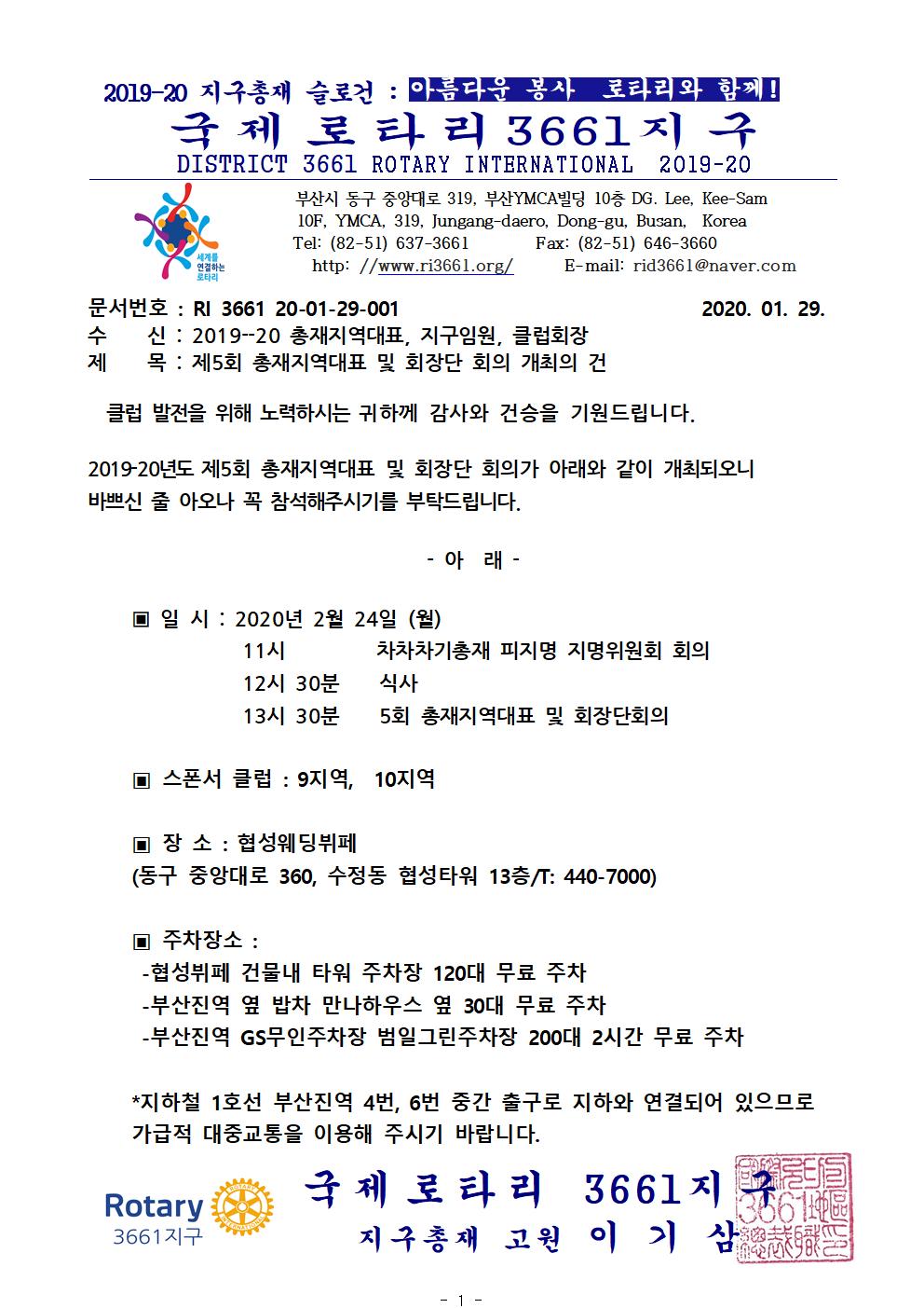 제5회 총재지역대표 및 회장단회의 개최 안내의 건