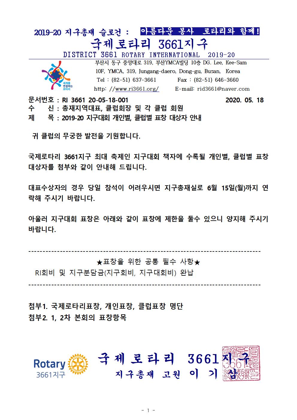 2019-20 지구대회 개인별, 클럽별 표창 대상자 안내
