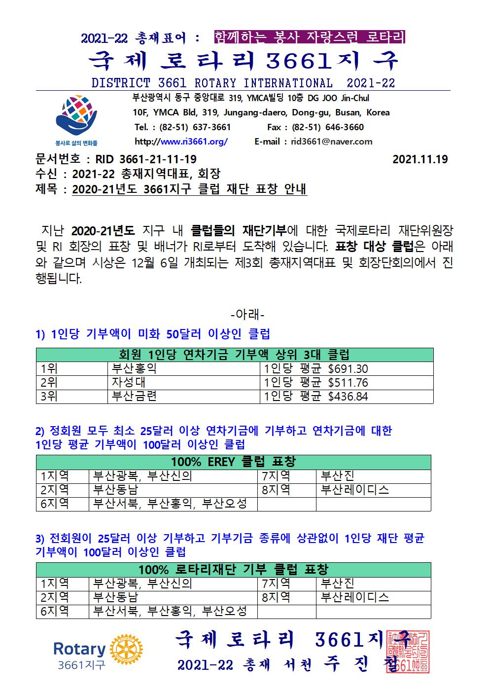 20-21 국제로타리 3661지구 재단 클럽 표창 안내