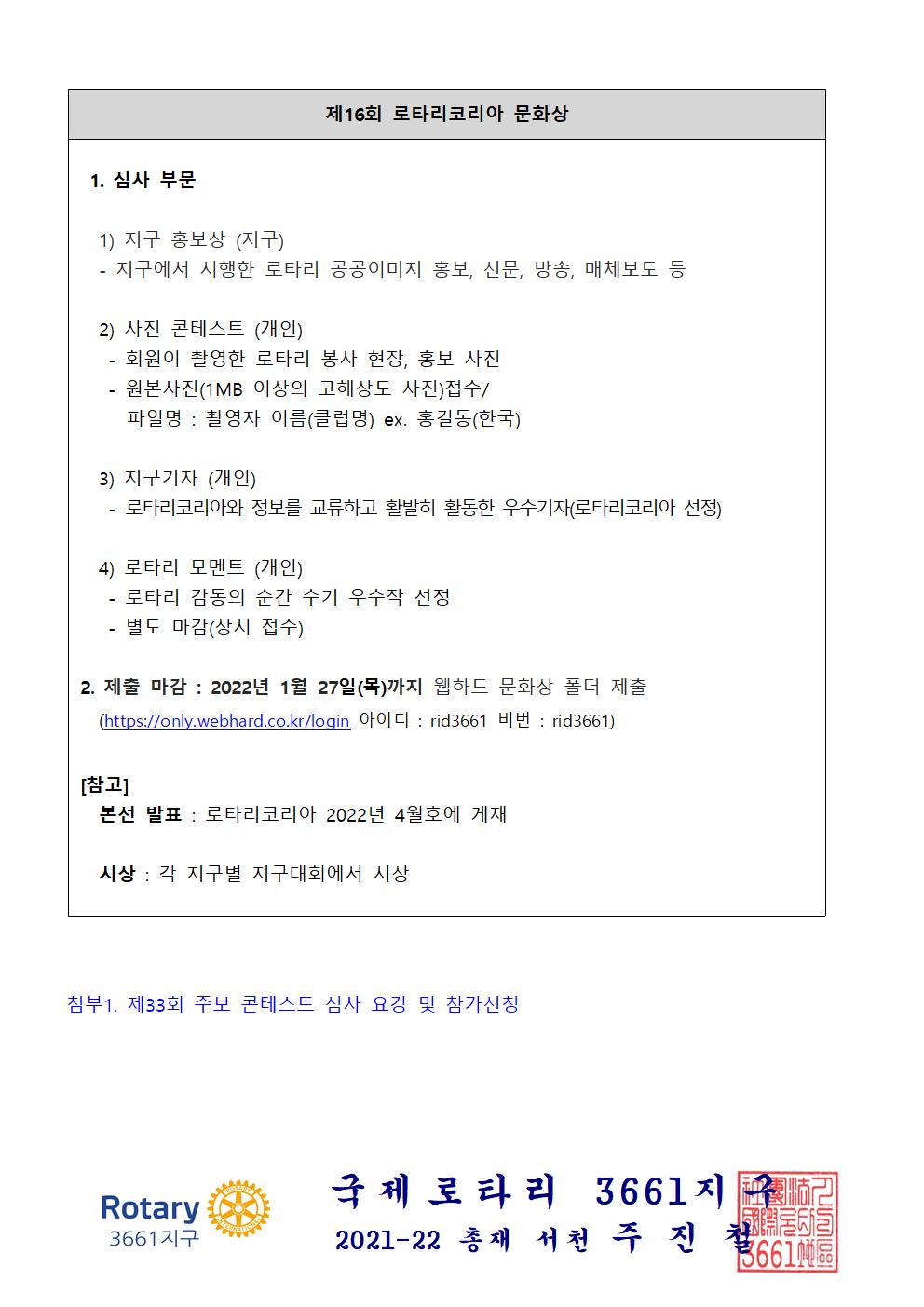 로타리코리아 33회클럽주보 콘테스트 및 문화상 응모 안내의 건