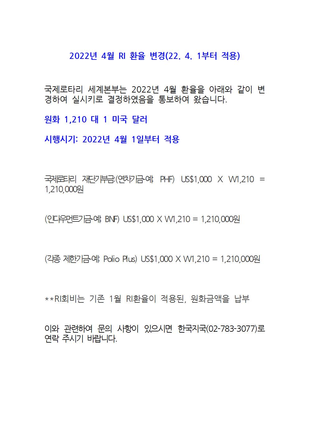 2022년 4월 RI 환율 변경(22. 4. 1부터 적용)