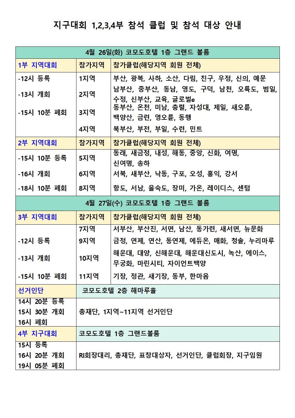 지구대회 1,2,3,4부 참석 클럽 및 대상 안내