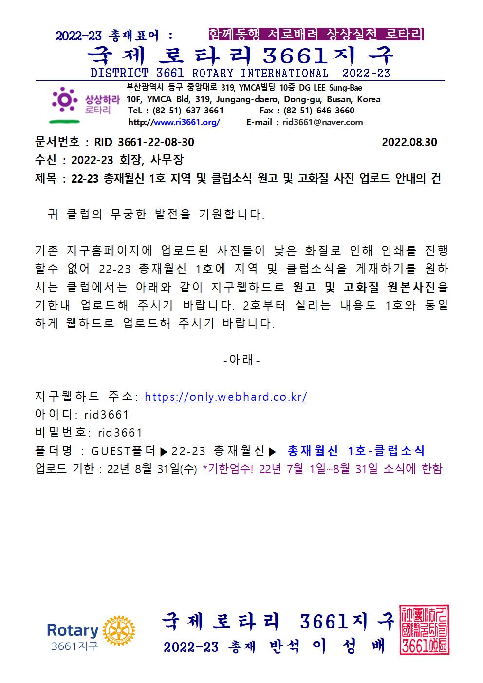 22-23 총재월신 1호 지역 및 클럽소식 원고 및 고화질 사진 업로드 안내