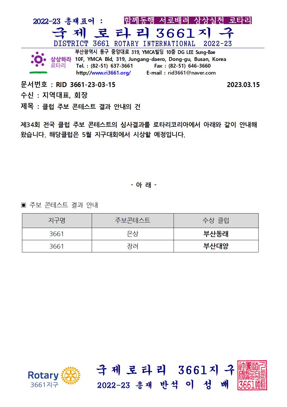 클럽 주보 콘테스트 결과 안내의 건