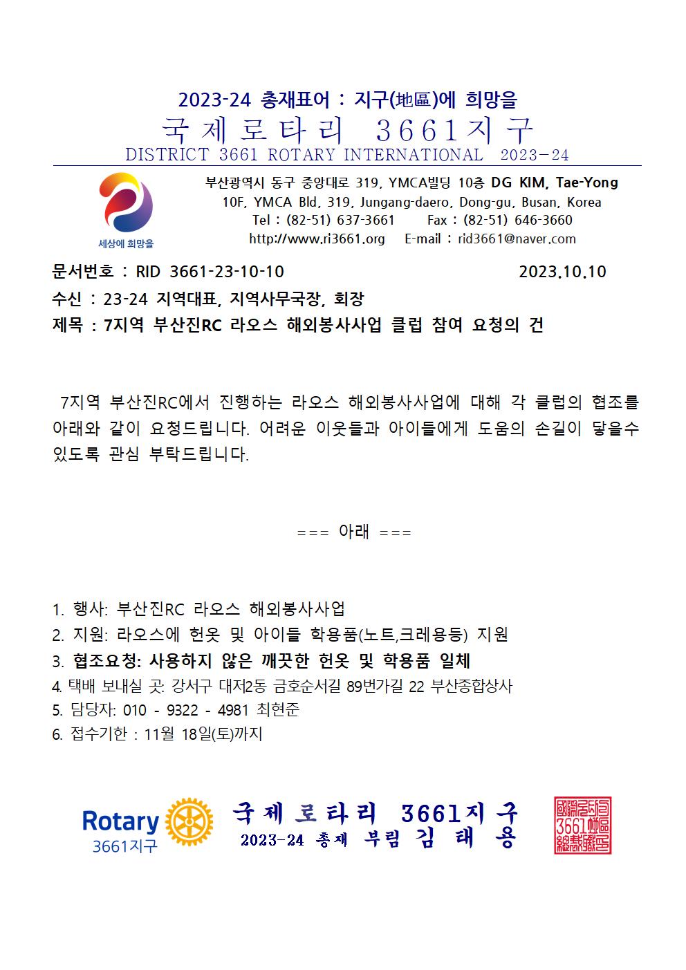 7지역 부산진RC 라오스 해외봉사사업 클럽 참여 요청의 건