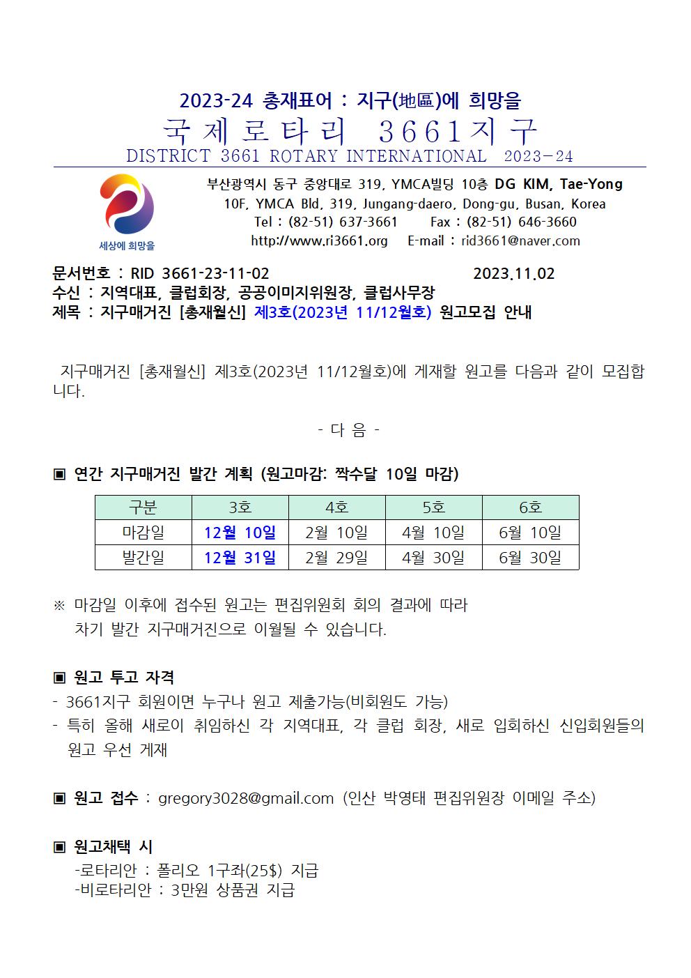 지구매거진 [총재월신] 제3호(2023년 11/12월호) 원고모집 안내