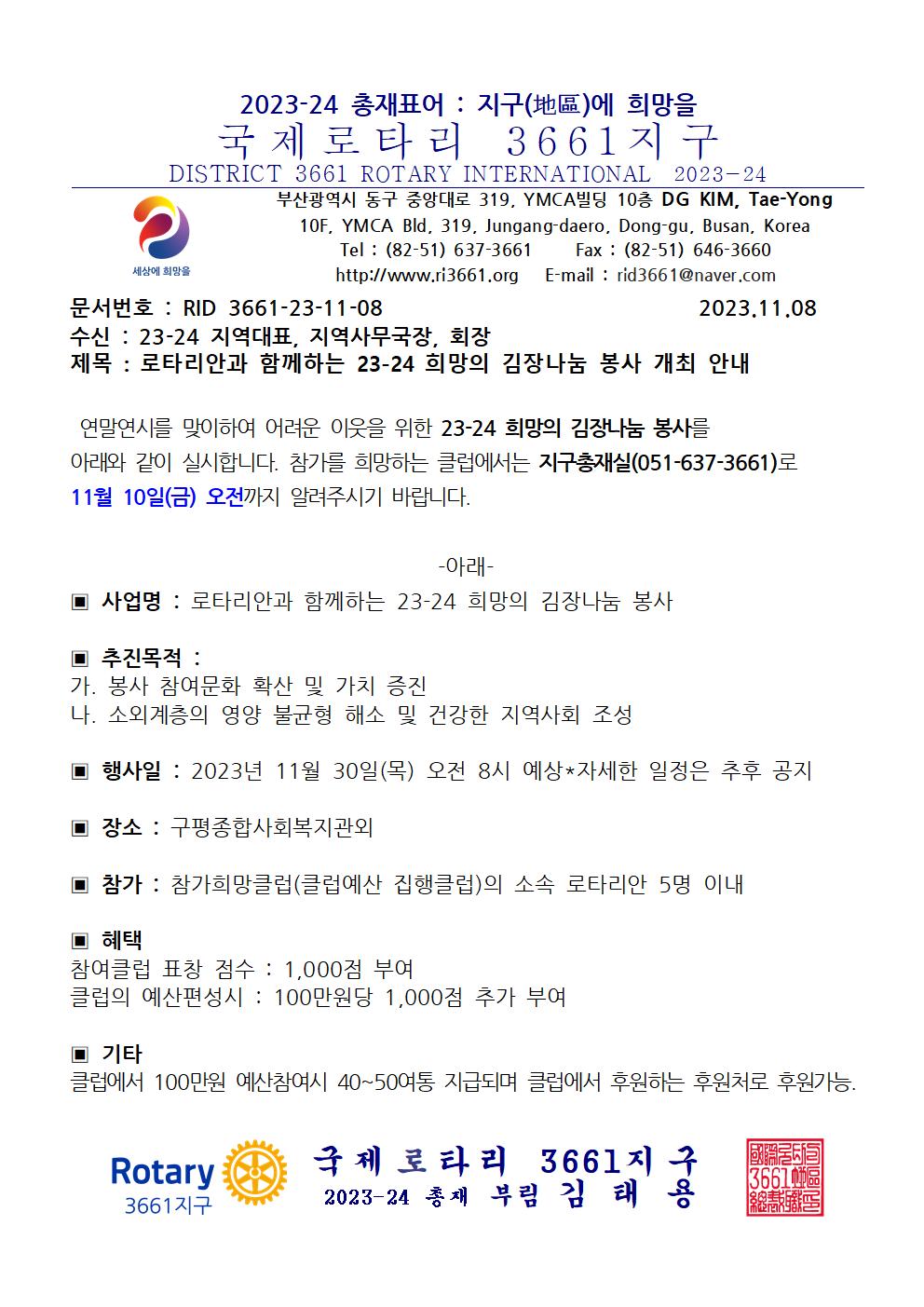 로타리안과 함께하는 23-24 희망의 김장나눔 봉사 실시 안내