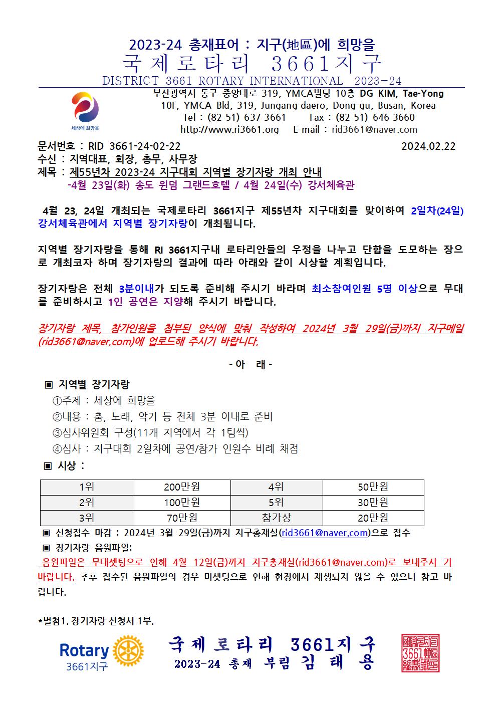 제55년차 2023-24 지구대회 지역별 장기자랑 개최 안내