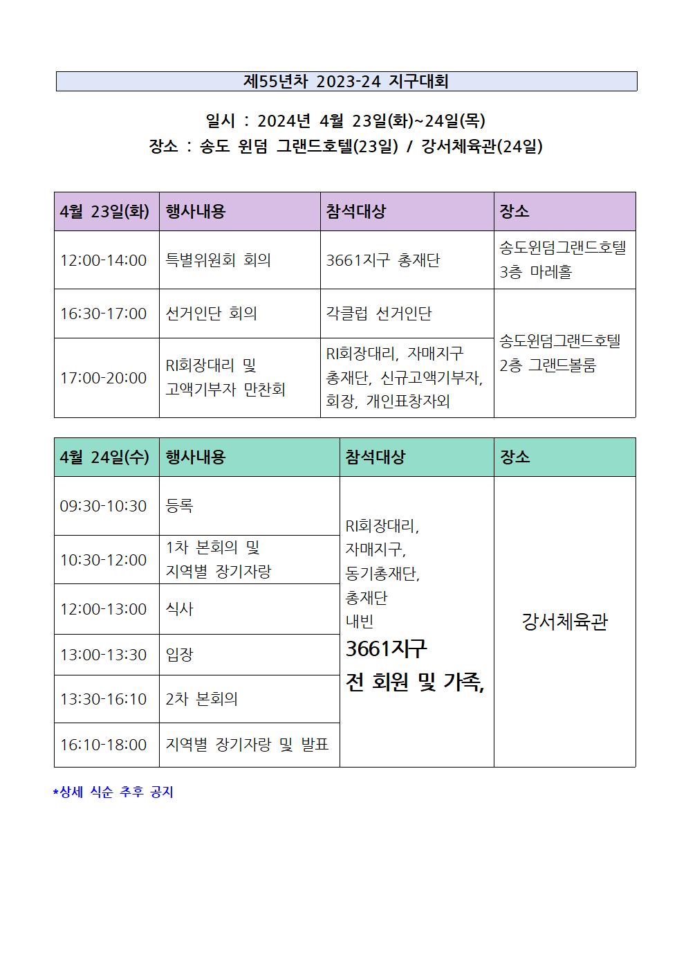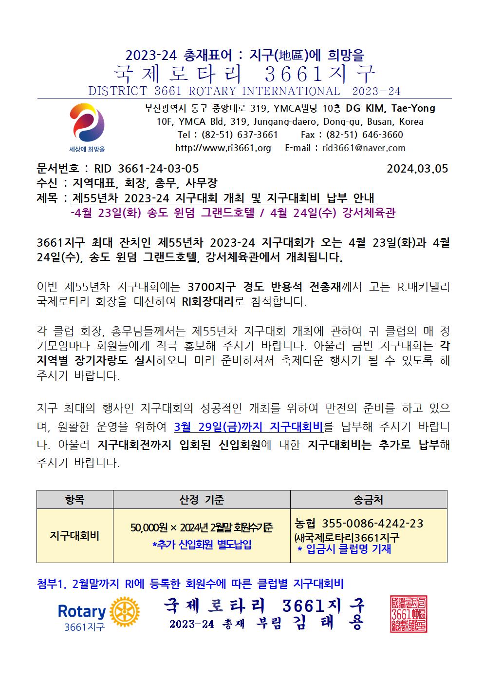 제55년차 2023-24 지구대회 개최 및 지구대회비 납부 안내